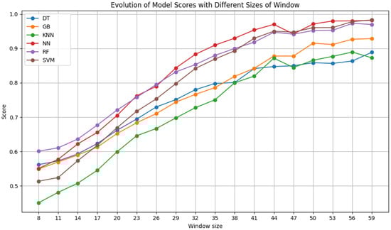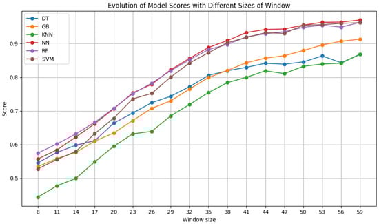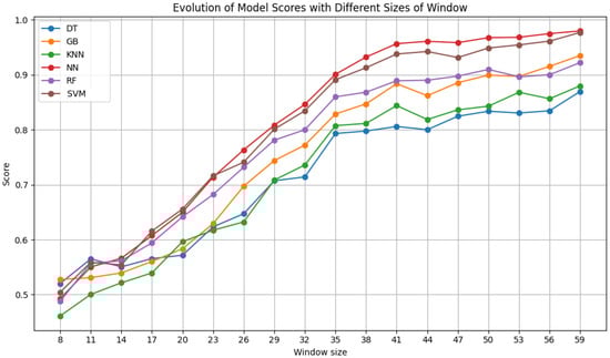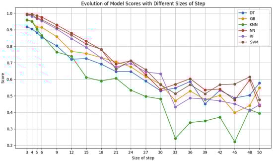 Figure 4 shows that for the ultrasound dataset, there is an improvement in results from 90 features onward for the decision tree, gradient boosting, KNN, random forest, and SVM models. The only exception is the neural network, which achieves the best results with 15 features. Initially, its performance oscillates significantly but becomes more stable up to 90 features, beyond which the performance visibly worsens. The neural network is the classifier with the best results for the smallest number of features, and its performance only drops when the other classifiers improve (90 to 100 features). This trend confirms that neural networks do well with fewer features, as they are less prone to overfitting. The noticeable drop in their performance for 90 features or more highlights the increase in network complexity and greater adaptation to the test data, which hampers their ability to generalize well. The other classifiers are more robust to this phenomenon, especially random forest and gradient boosting, which operate in a manner opposite to that of neural networks. Both utilize decision trees, which are highly capable of managing high-dimensional feature spaces and capturing increasingly complex non-linear relationships as the number of features increases.
