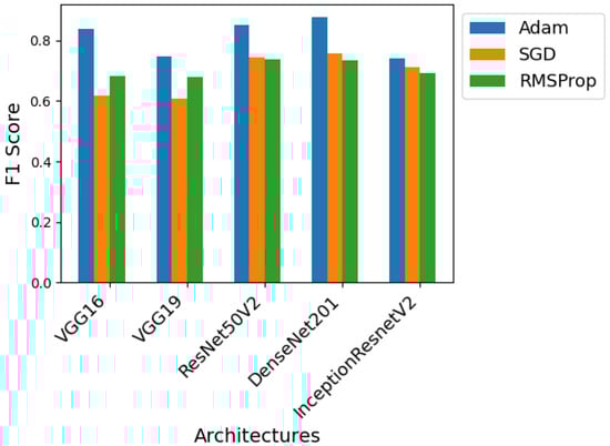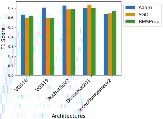 Finally, looking at Figure 13, where Dataset C is used for training, the Adam optimizer remains superior in most cases. The only exception is the Inception-ResNet-v2 architecture, which this time benefits from the use of SGD. Again, in certain cases, the usage of the SGD optimizer can be advantageous, and this Dataset And architecture proves to be one of those cases.
