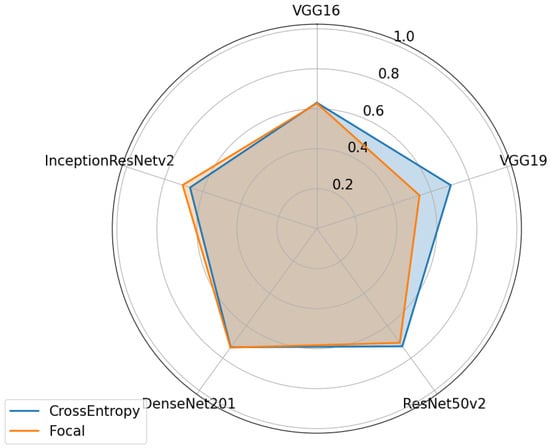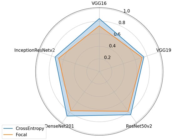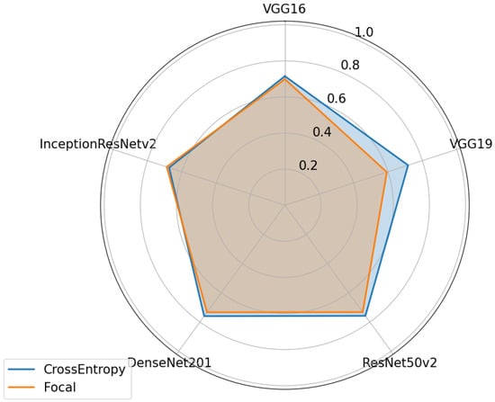 For Dataset B (Figure 15), the cross-entropy loss appears to be better for only 3 of the architectures, with VGG19 showing the largest difference and the difference being almost negligible for ResNet50VS and VGG16. For the other two architectures, the focal entropy loss appears to be better, with the difference being almost insignificant for the DenseNet-201 architecture. Inception ResNet, contrary to what was observed in Figure 14, improved with the use of the focal loss function this time. Although focal loss is more advantageous in the case of unbalanced data, it can contribute to more efficient model training, resulting in a better generalization capacity even in balanced sets.