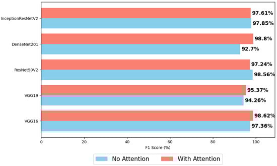 Figure 17 shows that the addition of the attention mechanism for ultrasound images improves the performance of four of the six models. The VGG16 and VGG19 architectures show a negligible performance improvement of close to 1%, achieving F1 scores of 98.62% and 95.37%, respectively. The DenseNet-201 architecture, on the other hand, improves significantly with this addition, proving that attention has managed to synthesize and collect relevant information in the different heads, improving the model’s convergence and generalization capabilities. DenseNet-201 achieves the highest F1 result of this dataset (98.8%). On the other hand, ResNet50V2 with an attention mechanism performs worse, with results ranging from 98.56% to only 97.24%. The Inception-ResNet-v2 architecture also performs worse when multi-head attention is used, but the difference is practically negligible.