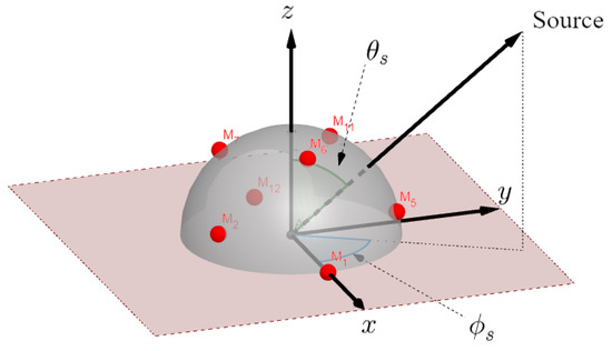 Similar to the spherical harmonics [13,16,38], the sound pressure can be sampled over a spherical sector using the spherical sector harmonics basis function. Specifically, for an incident plane wave impinging on a spherical sector (see Figure 1 for a hemispherical microphone array) from direction , the pressure field sampled at a location on the spherical sector is provided as follows [22,23,24]: