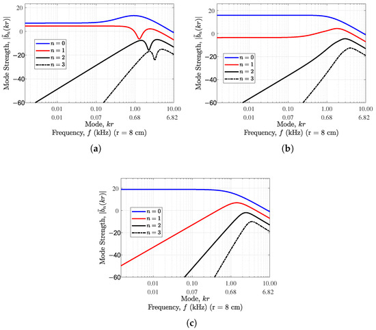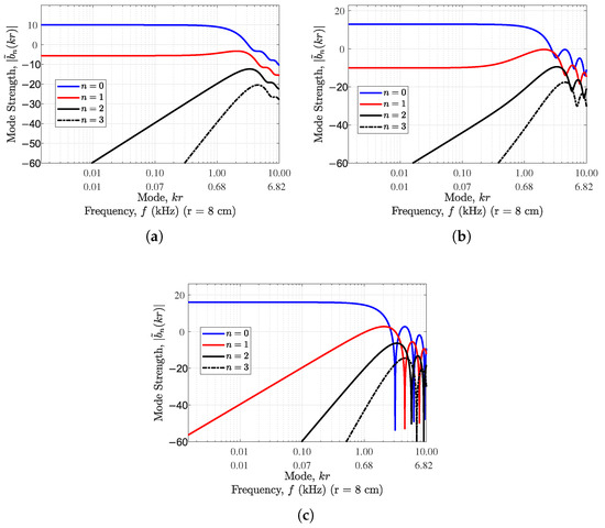 Generally, as n increases, the amplitude of the spherical Bessel function decreases at small ; however, the term decreases as n increases for the spherical sector, adding to the clear amplitude difference across n. It can be seen that as the value of decreases, the mode strength decreases with increase in mode for order ; however, for orders greater than 0, the modal strength is higher for lower values of . This reduction in zeroth-order mode strength for lower values is compensated by the elimination of the spherical Bessel function null effect (see Figure 2). This implies that such an array of cardioid sensors has nonzero values for all modes (i.e., frequencies), a problem that affects the array of omnidirectional sensors (see Figure 2c).