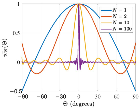 It can be seen that the directivity function of the plane wave is a function of order N, angle , and u, but not a function of the cardioidicity index . Using the ideal beamformer provided in [25] (Equation (24) for the ℓ-th sensor, we have
