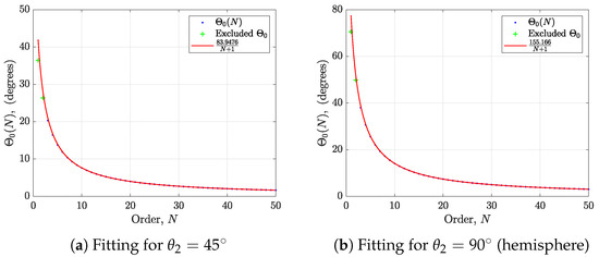 To illustrate this, we can look at a case of spherical cap; the spherical sector is bounded along the polar angle by , where . To establish a simple equation for the spatial resolution as a function of the order N and or of a spherical cap, we can perform a versus N curve fitting for each (or ), as follows: