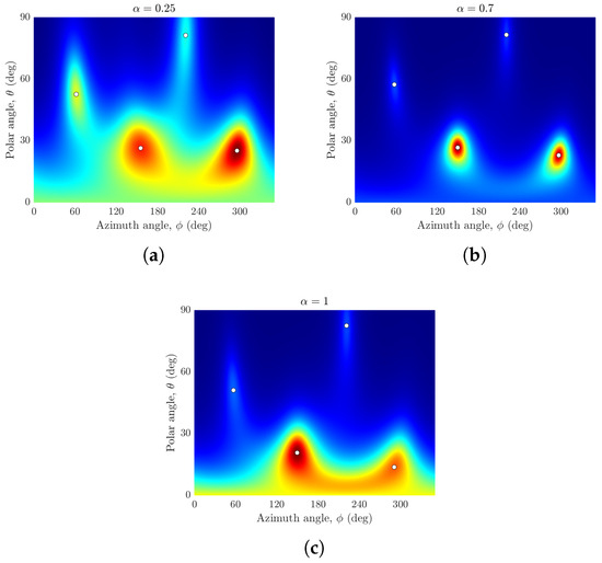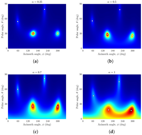 For processing, we used the center frequency of and 20 frequency bins. Plots of the sample beampattern versus the polar and azimuthal angles for various values of are shown in Figure 6 for an open hemisphere. For the open hemisphere, the spatial spectrum degrades as the value of increases towards 1. The open hemispherical array of omnidrectional microphones produced the least smooth spatial spectrum (see Figure 6d). This can be attributed to the spherical Bessel function null for some frequencies in the modal strength of this array, as discussed in Section 2.3.