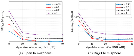 Plots of the cumulative mean error versus the signal-to-noise ratio for various are shown in Figure 8 for the open hemisphere (Figure 8a) and rigid hemisphere (Figure 8b). For the open hemisphere, the CME value increases with the value of for all considered SNR values. This is in consonance with the analysis in Section 2.3. For the rigid hemisphere, the array of cardioid microphones outperformed the array of omnidirectional microphones. This performance varies with direction of arrival, as the performance of the omnidirectional microphone array tends to be consistent across different directions of arrival.