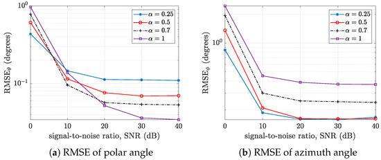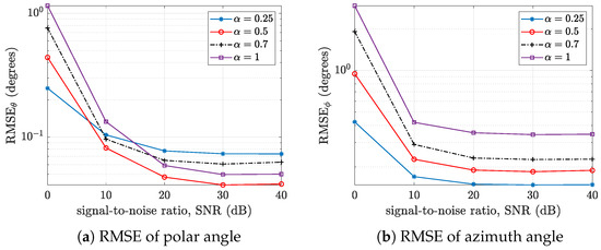 Plots of the root mean square error (RMSE) versus the signal-to-noise ratio (SNR) of an open hemisphere with various for (a) the polar angle and (b) the azimuthal angle .