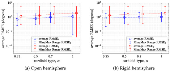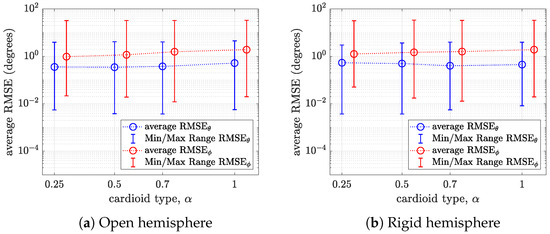 Plots of the average and minimum and maximum RMSE of the polar and azimuthal angles versus the cardioid type for (a) an open hemisphere and (b) a rigid hemisphere for an SNR of 50 dB.