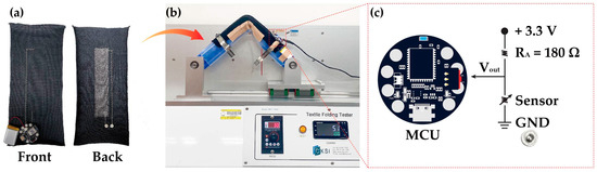 Preparation for bending test: (a) front and rear sides of knitted strain sensor connected to MCU; (b) E-textile flexing tester; and (c) circuit diagram for calculating sensor voltage.