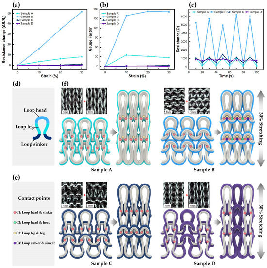 Variations in (a) resistance change rate and (b) GF with stretching; (c) results of five repeated stretching tests; (d) loop component; (e) contact points; (f) sensor surface variations and sensing mechanisms before and after stretching.