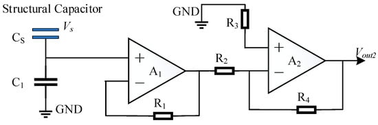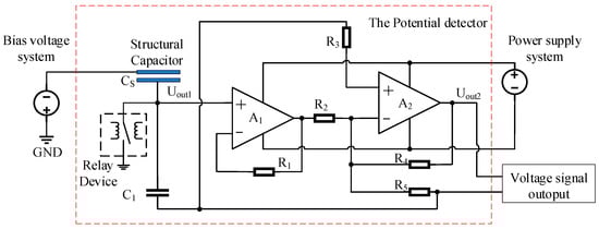 The spacecraft surface potential detector design features an equivalent circuit depicted in Figure 3. In this circuit, the structural capacitance Cs is formed by coupling two metal plates (a floating electrode and a sensing electrode), which are separated by a high-resistance polyimide spacer. A1 represents a voltage follower circuit characterized by its high input impedance and low output impedance. This circuit not only achieves impedance matching but also serves as a signal buffer and isolator. A2 is an amplification circuit responsible for increasing the amplitude or power of the input signal, thereby enhancing signal quality. The relationship between the surface voltage to be measured, and the output voltage of the detector is given as follows: