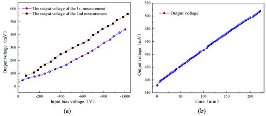 Using the detector designed above for potential measurement experiments, Figure 4 presents the output results of the probe from two measurements. It can be observed that the two measurement results are inconsistent (Figure 4a), indicating poor repeatability in potential measurement. Furthermore, when a bias voltage of −1 kV is applied to the floating electrode, the potential output signal exhibits significant output drift. As time accumulates, the output drift becomes more pronounced, leading to a notable increase in output error (Figure 4b).