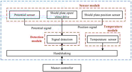 The functional modules of the potential measurement probe comprise a shielding plate opening/closing drive mechanism, a position sensor, and a potential sensor. Before measuring unequal electric potentials, charge zeroing is performed first. The drive mechanism actuates the shielding plate to initiate zeroing of both the sensor probe and the circuit. The position sensor enables the perception of the drive device’s operational status while the potential sensor processes and transmits potential signals between the sensor probe and the controller.