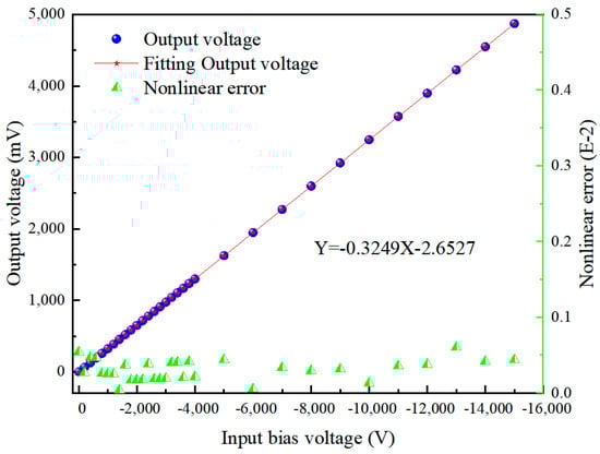 Figure 10 and Figure 11 present the output voltage characteristics of the improved detector after performing the zero-setting operation. Figure 10 reveals a good linear relationship between the output voltage and the input bias voltage. By conducting a linear regression analysis on the input–output data, we obtained a fitting curve, which can serve as the calibration curve for the detector. Specific data are provided in Table 2. Further analysis of the linear error in Figure 10 shows that the maximum nonlinear error of the probe is controlled within 0.1%. It can be seen that the improved detector exhibits good output linearity. (Here, the nonlinear error is defined as the maximum deviation between the corrected output–input curve and its fitted linear curve, typically expressed as the relative error , where represents the maximum nonlinear deviation of the output and is the full-scale output).
