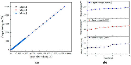 Probe output drift results: (a) comparison of probe output results across multiple measurements; (b) drift of probe output results over time with −1 kV bias input.