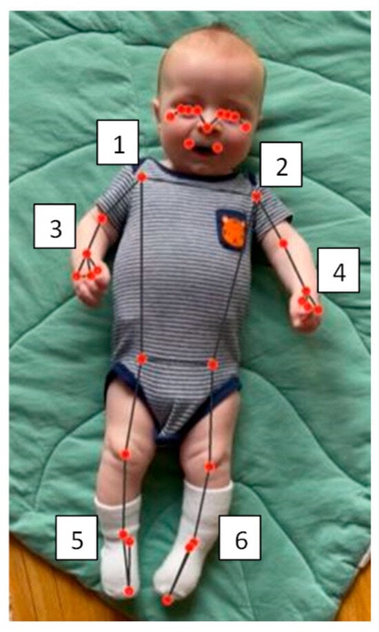 Advancements in technology, digital health, and remote monitoring are making the ability to collect sophisticated and objective pediatric movement data feasible, cost-effective, and ecological [1,2]. Devices such as wearable sensors [1,2,3] and portable markerless multi-camera 3D motion analysis systems [4,5,6,7,8] make the collection of human movement data possible in many environments (i.e., home, day care, sports field, research laboratory). The potential of these systems to detect, identify, and measure changes in symptoms, including those that are present in everyday life, is exciting. While these tools produce meaningful results, they require either a device attached to the infant (wearable) or specialized cameras. However, there is another analysis tool that can address these limitations and has shown promise in measuring movements in adults and children from a video recording [9].