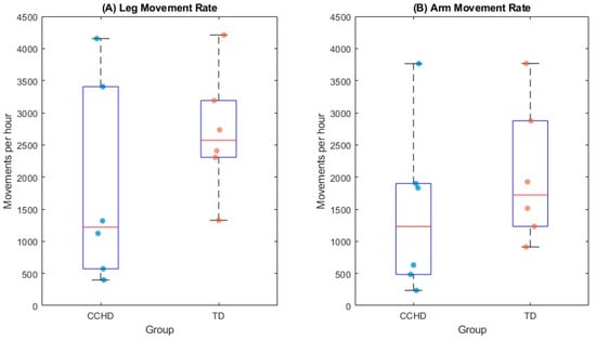 Box plots for leg (A) and arm (B) movement rate between infants with (CCHD) and without (TD) complex congenital heart disease. Dots on each plot represent average individual movement rate data. Edges of the box represent the 25th and 75th percentile, the middle line in the box is the median, and whiskers represent maximum and minimum values.
