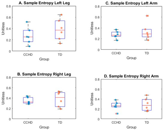 Median sample entropy in the left and right arms was 0.27 and 0.32 for CCHD, respectively, and 0.29 and 0.27 for TD. Median sample entropy in the left and right legs was 0.25 and 0.32 for CCHD, respectively, and 0.37 and 0.41 for TD. The box plot in Figure 4 depicts the sample entropy for both groups in all four limbs. There was no statistical difference between the groups for sample entropy for left and right arm and leg movement (p > 0.05). Infants with TD tended to have larger sample entropies for both side and limbs, meaning that the TD group may have produced more variability in their movements. There was a medium effect size for left leg movements (r = 0.32) and a low effect size for left (r = 0.25) and right (r = 0.13) arm movements and right leg movements (r = 0.15), suggesting that the TD group showed more variability in the leg that activated the mobile (i.e., the right leg).
