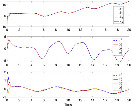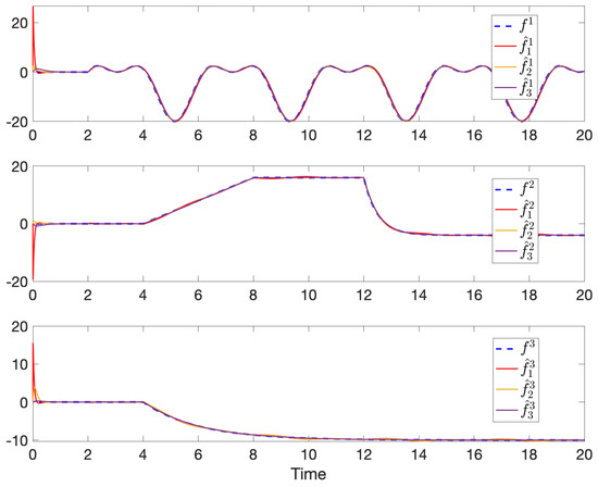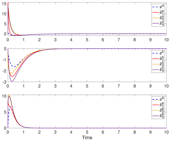 The second example is extended to verify the proposed fully distributed observers for the spacecraft attitude control system. The control input is selected as a state-feedback (or an observer-based output-feedback) controller such that the states satisfy asymptotical stability. Consider the same values for the system’s parameter matrices as in Example 1. Here, the initial value of the states is selected as . The parameters in the adaptive gains are , and the initial values of for are selected as . The faults are selected as constant values, that is, , to represent the stuck faults frequently occurring in the spacecraft attitude control system. Disturbances are assumed not to exist.