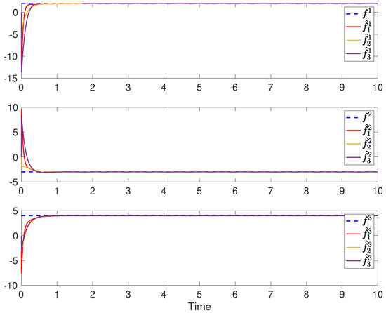 The simulation results of fully distributed state and fault estimation for the spacecraft attitude control system are shown in Figure 5, Figure 6 and Figure 7. In Figure 5, it can be found that for converges to some finite value ultimately. Then, one can see from Figure 6 and Figure 7 that the attitude angular velocities and the injected constant faults can be asymptotically estimated by all observers in the absence of disturbances. Moreover, in light of (30), it can be deduced that asymptotically converges to 0 according to Figure 6 and Figure 7. Therefore, it is concluded that the adaptive gain ultimately converges as well. Thus, the properties of the proposed fully distributed observers are illustrated.