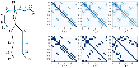 As shown in Figure 1a–c represent the topological diagrams of the first-order, second-order, and third-order adjacency matrices used to connect human skeletal joints in a multi-scale spatial model. As the order of the adjacency matrix increases, joints closer to the current joint are assigned greater weights (the darker the color, the greater the weight assigned to the joint). Especially when introducing new joints to refine human skeletal features, the distance between the original two joints may increase due to the newly added joints; thus, the weights assigned to each other by the two joints will be further reduced. Figure 1d–f represent the topological graphs after constructing a multi-scale adjacency matrix; at this time, the adjacency matrix is reasonably sparsified, enabling the model to assign equal weights to distant joints and better capture the relationships between joints that are farther apart.