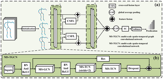 Framework of multi-scale spatio-temporal graph convolutional network model incorporating multi-granularity features. (a) represents the overall framework of the proposed network, and (b) represents the framework of the multi-scale spatio-temporal convolutional module.