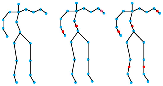 Three granularity representation methods for MSR Action 3D. The blue nodes represent the original coarse-grained joints, and the red nodes represent the newly added fine-grained joints.
