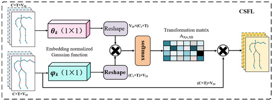 Taking 20-joint coarse-grained skeleton information and 25-joint fine-grained skeleton information as examples, the feature dimensions of the two input granularity features and are and , respectively, where represents the number of channels of the embedded Gaussian function. A 1 × 1 convolution operation is performed on both of the two granularity features, then dimension transformation is applied to both results, followed by matrix multiplication. Finally, an adaptive transformation matrix is obtained through a softmax classifier as follows: