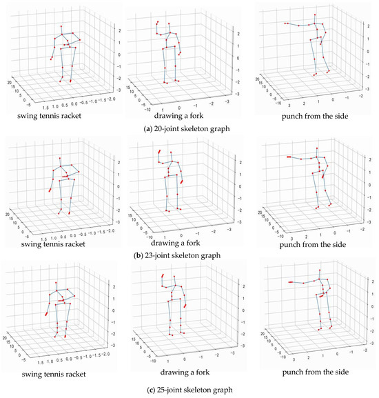 The fine-grained features of human joint information can fully represent refined semantic features during human movement. The 20-joint skeleton data in the MSR Action 3D dataset are refined into 23 and 25 joints using the method proposed in Section 3.2, as shown in Figure 5. Then, comparative experiments are conducted on the skeleton data of different fine-grained levels.
