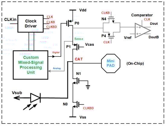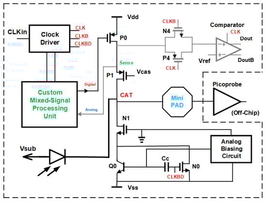 We modified the gated, cascoded CMOS SPAD receiver presented in [16] by exchanging the quenching N-type MOSFET in the cascoded switch with a bipolar NPN transistor. This was motivated by the higher transconductance of bipolar transistors compared to that of MOSFETs [24,25]. The simplified circuit diagram of the resulting BiCMOS SPAD receiver is presented in Figure 1. Transistor Q0 is the bipolar NPN quenching switch. The P-channel MOSFET P0 is the charging switch. Q0 and P0 are cascoded with N1 and P1, respectively, to increase the voltage swing at the cathode of the SPAD to twice the nominal supply voltage of 3.3 V of the 0.35 m BiCMOS process used, i.e., to 6.6 V. This 6.6 V can be used as maximum excess bias voltage of the SPAD in order to achieve a high photon detection probability. An “analog biasing circuit” (see Figure 1) prebiases the NPN transistor to obtain highest switching frequencies of up to 1000 MHz [26]. Here, we do not use the complete receiver. Only the clock and the cascoded gating switch are necessary to charge the SPAD to breakdown voltage plus excess bias (with P0 and P1), let the SPAD float during the positive gate phase (this is the gate window, in which the SPAD can detect a photon), and to switch the SPAD off with Q0 (plus N0) and N1 until the next charging will be performed. The other components of the front end of the receiver add parasitic capacitance to the cathode node CAT. This parasitic capacitance determines the avalanche build-up time. For the characterization of the avalanche build-up time of the SPAD, we integrated a mini-pad of octagonal shape (in metal layers M3 and M4) with a diameter of 46 m and an opening of 36 m inside the passivation layer.