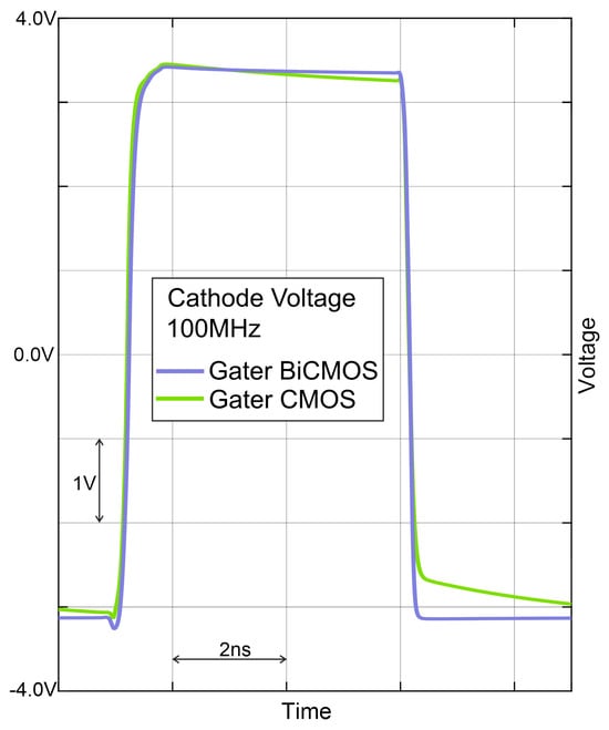 Instead of the bipolar transistor with dynamic coupling at the base and circuitry for analog (pre)biasing, an N-channel MOS transistor N0 is placed, which is switched on and off by the gater clock. The results of the comparison with a post-layout simulation of switching the cathode voltage of the SPAD are depicted in Figure 3. For gating with the bipolar transistor, rise and fall times (10–90%) of 251 ps and 162 ps, respectively, were determined. Instead, the CMOS gater had rise and fall times of 236 ps and 185 ps, respectively. It can be seen that the fall time (quenching time) is more than 10% shorter with the bipolar quenching switch and that the sum of rise and fall times is slightly better for the bipolar gating circuitry. Another advantage is the better capability of the bipolar transistor of pulling down the cathode potential to . There exists a slow settling to for the CMOS gater. It originates from parasitic coupling via parasitic capacitances from and to the gate of cascode transistor P1. However, P1 is implemented in both schematics. But due to the “stronger” NPN transistor, these parasitic capacitances do not matter.