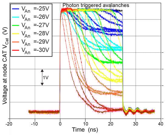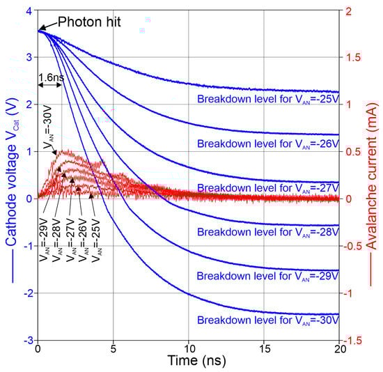 In Figure 8, the results of the calculation of the avalanche current through the SPAD during avalanche according to Equation (1) for different anode voltages = are depicted. The time dependence of the avalanche current is drawn in red. The first peak corresponds to the maximum current, which occurs after the avalanche is built up. falls further due to discharging through the SPAD until the avalanche is quenched when the breakdown level is reached. For anode voltages lower than −28 V, a second (small) peak can be observed in the time dependence of the current. This second peak occurs because the effective capacitance becomes lower during a voltage drop of , and in the transition region around 0 V both cascode transistors N1 and P1 (see Figure 1) are turned off. Further dropping turns on N1 and is effectively larger again. However, for calculating the current to observe rise of avalanche including peak current, the effective capacitance for turned on P1 and turned off N1 is relevant.