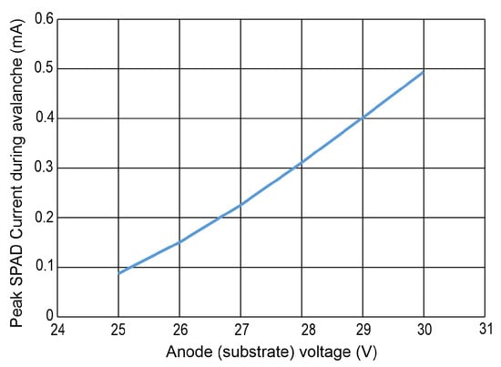 Peak current during avalanche of SPAD vs. substrate voltage.