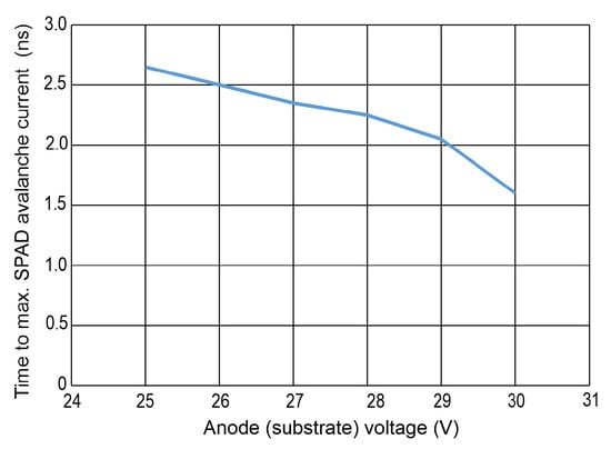 The time after which the maximum avalanche current occurs is plotted in Figure 10 for the different substrate voltages. For the largest excess bias voltage (largest magnitude of the anode voltage), the peak avalanche current is reached in 1.6 ns. This avalanche build-up time is almost a factor of 2 shorter than in [16], where the SPAD diameter was 50 m and the SPAD and gater were connected via two bondpads.