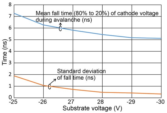For a substrate voltage of = −25 V, the avalanche fall time amounts to 7.3 ns. It drops to 5.1 ns for = −30 V, which corresponds to a larger excess bias of 6.1 V. A fast comparator, however, can detect the avalanche much earlier.