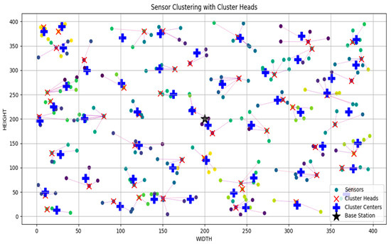 randomly. Clusters are formed, and cluster heads (CHs) are selected based on their energy efficiency and transmission error rates (Bit Error Rate (BER)). Sensors locate the CHs using the optimal distance. The study also considers only five sensors as a cluster around each CH at any given time.