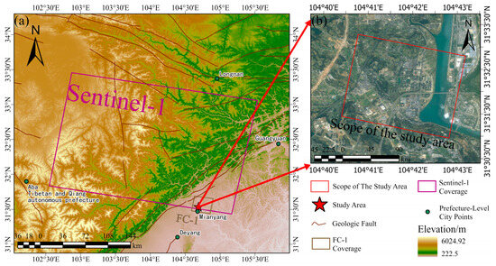 The research area is located in Mianyang, Sichuan Province, China, the only Science and Technology City in China, also known as Fucheng, after which the FC-1 satellite is named. The region’s altitude varies significantly, with peaks of 2345 m in the northwest and dips down to 501 m in the southeastern direction. The Longmenshan Fault, running in the northeasterly direction, is the primary influence on the landscape. The Songpan–Ganzi Fold System is found to the west, while the Sichuan Basin is situated to the east [34]. The geographical layout of the campus extends 2000 m from east to west and 1500 m from north to south, covering a total area of 2.72 × 105 m2. The total building area of the campus is 1.15 × 106 m2. The topography of the entire campus is characterized by higher elevation in the west and lower elevation in the east, with the slope of the original ground ranging from 10 to 30°. Both the campus and the surrounding area are used as the study area, and Sentinel-1 covering the study area is used to make a comparison with the FC-1 satellite, which is shown in Figure 1. The campus is located in a hilly area with a gently sloping topography, which is characterized by a shallow slope with a hilly slope geomorphology. Geologic divides are traversed within the area, and the main geologic compositions are grayish-yellow and purplish-red chalky clay, sandy mudstone, fine sandstone, and chalky clay containing sandy mudstone fragments. The study area is characterized by mild climatic conditions and abundant rainfall, with an average annual rainfall of 963.2 mm. The rainfall characteristics include a concentration of rainfall over a short period, heavy rainfall over several consecutive days, and periods of concentrated rainfall.