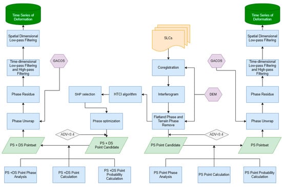 Phase optimization not only preserves the original resolution of SAR images but also suppresses phase noise, resulting in the achievement of a comparable quality in the DS candidate points to that of the PS points. Further point selection, 3D unwrapping, and time-series processing were then conducted using the StaMPS package, resulting in time-series data for both the DSs and PSs. The parameter settings and processes for DSI time-series processing were consistent with those used in PSI (the key parameters are set in Table 2).