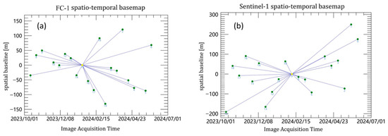 Firstly, Sentinel-1 images were co-registered to an image acquired on 7 February 2024 by iteratively applying intensity matching and using the “spectral diversity” method, achieving a co-registration accuracy of one-thousandth of a pixel. For FC-1, all of the images were co-registered to an image acquired on 19 January 2024 using a resampling method, with a co-registration accuracy of 0.2 pixels deemed sufficient to meet the interferometric processing requirements. To ensure consistency, images from both satellites covering similar time periods were selected for the time-series analysis, and master images were chosen from similar time periods during the processing. For the FC-1 satellite and Sentinel-1, we used images from 19 January 2024 and 7 February 2024 as the respective master images, with the resulting spatio-temporal baseline maps presented in Figure 3.