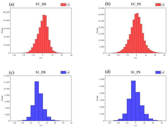 (a,b) Histograms of deformation velocity from FC-1 using the DSI and PSI methods. (c,d) Histograms of deformation velocity from Sentinel-1 using the DSI and PSI methods.