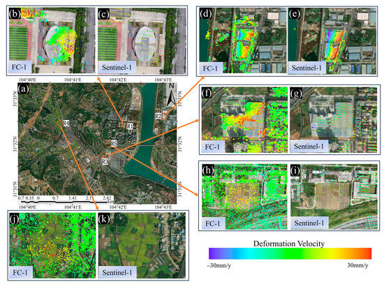 (a) Schematic diagram of the research area on Google Earth. (b,c) Deformation rate maps of region R1 obtained by FC-1 and Sentinel-1 using the PSI method, with a drone image as the base map. (d–g) Deformation rate maps of regions R2 and R3 obtained by FC-1 and Sentinel-1 using the PSI method, with Google Earth as the base map. (h–k) Deformation rate maps of regions R4 and R5 obtained by FC-1 and Sentinel-1 using the DSI method, with Google Earth or a drone image as the base map.