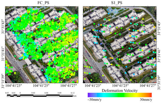 First, the FC-1 satellite demonstrates a significant advantage in terms of point density over Sentinel-1, primarily due to its higher spatial resolution. Compared to Sentinel-1, FC-1 exhibits a 12.4-fold increase in the number of PS points and a 16.9-fold increase in the number of DS points, offering more detailed deformation measurements and enabling a finer observation of the deformation patterns in urban areas. This is crucial for infrastructure monitoring, as the higher density of PS and DS points facilitates better detection of deformations in buildings and other man-made structures.