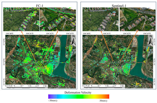 (a,d) Deformation velocity maps from FC-1 and Sentinel-1 using the PSI method, with schematic maps of ZZ1 and ZZ2 locations. (b,c) PS deformation points from FC-1 overlaid onto drone oblique images of ZZ1 and ZZ2. (e,f) PS deformation points from Sentinel-1 overlaid onto drone oblique images of ZZ1 and ZZ2.