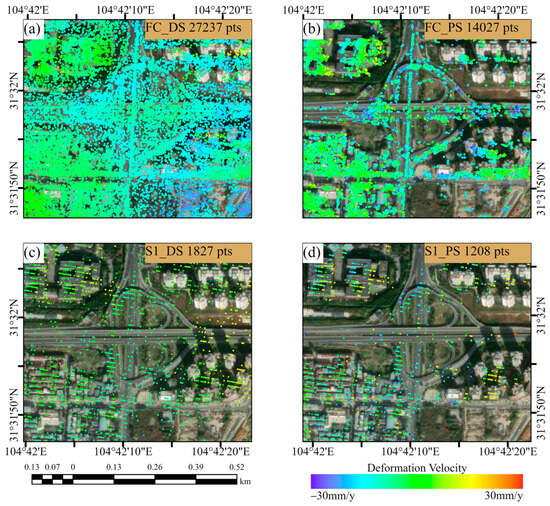 The results of converting the deformation velocity of the two satellites into the vertical direction are shown in Figure 4. Through analyzing the deformation velocity map, it can be found that the high resolution of FC-1 results in a markedly higher density of PS and DS points during PSI and DSI processing compared to the density obtained by processing the Sentinel-1 satellite data. Specifically, the FC-1 satellite collected 241,696 PS points and 577,047 DS points, while Sentinel-1 obtained only 18,076 PS points and 32,263 DS points. The former yielded 13.4 times more PS points and 17.9 times more DS points than the latter, and more points facilitate a clearer observation of the deformation distribution.