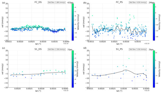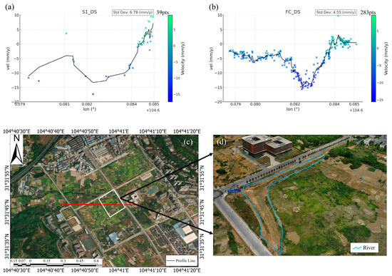 (a,b) Deformation velocity profile of FC-1 under the DSI and PSI methods. (c,d) Deformation velocity profile of Sentinel-1 under the DSI and PSI methods.
