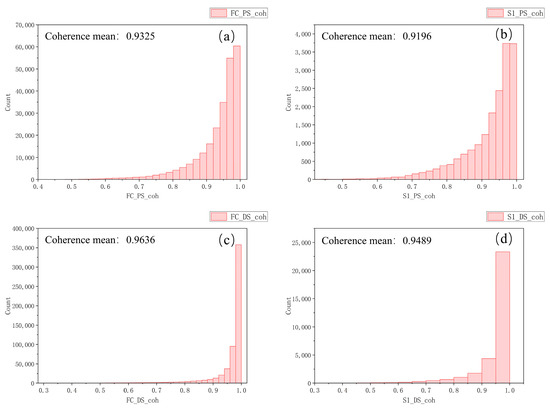 (a,b) Coherence histograms and average coherence values for the PSI method with FC-1 and Sentinel-1. (c,d) Coherence histograms and average coherence values for the DSI method with FC-1 and Sentinel-1.