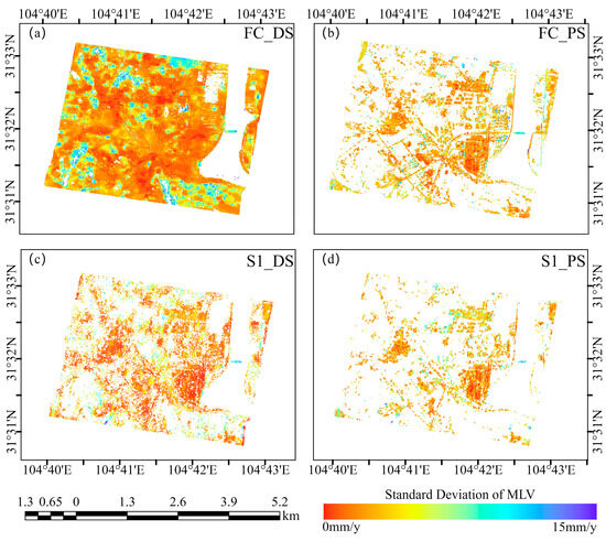 (a,b) Standard deviation maps of deformation velocity for Sentinel-1 using PSI and DSI methods. (c,d) Standard deviation maps of deformation velocity for FC-1 using PSI and DSI methods.