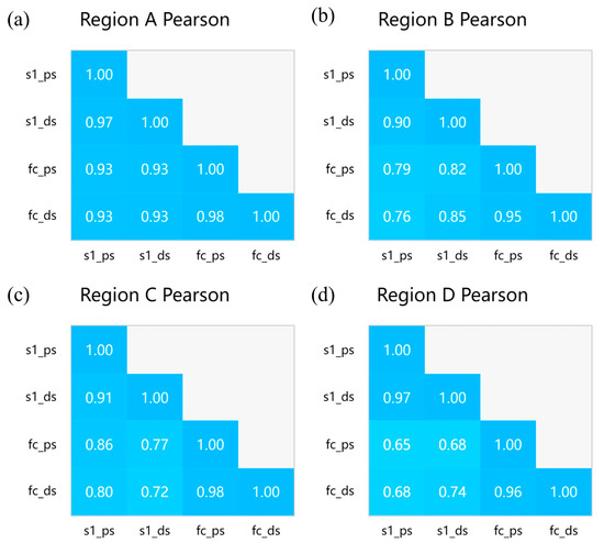 (a–d) Pearson’s correlation matrix plots of the time-series subsidence values between FC-1 and Sentinel-1 using the DSI and PSI methods in four regions.