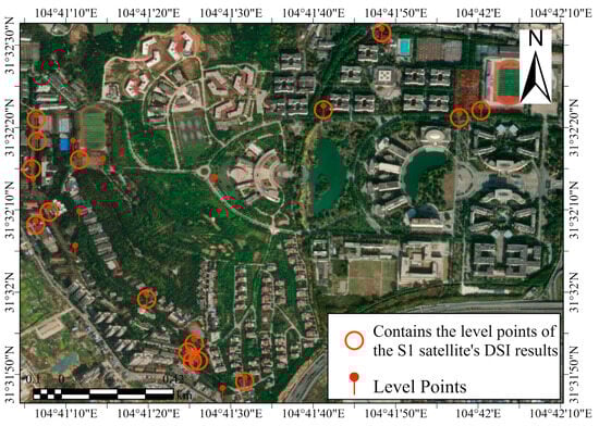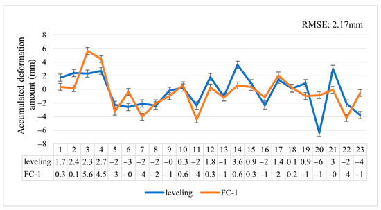 For the leveling measurements, we used a Topcon DL501 electronic level, which has an accuracy of 0.3 mm, meeting the requirements for validating InSAR subsidence monitoring. We conducted a round-trip leveling survey in accordance with the second-class leveling standards; obtained data for two periods, 1 October 2023 and 1 June 2024; and calculated the deformation between these two dates. The distribution of the leveling point positions can be seen in Figure 18. Since PSI only yielded a smaller number of PS points, not all of the level points were supported by the PS points. However, in this particular case, the DSI image proved adequate for analysis. We compared the average cumulative deformation of the points within a 10 m radius around the leveling points with the settlement data derived from the leveling measurements. Figure 19 specifically presents the results on vertical displacement obtained from DSI and leveling. As depicted in Figure 19, the settlement measured by FC-1 closely resembles the results from the leveling measurements, with a maximum error of 5.52 mm, an average error of 1.76 mm, an RMSE of 2.17 mm, and a minimum error of only 0.34 mm. This demonstrates that the capability of FC-1 in deformation monitoring achieves a millimeter-level precision, making it suitable for future surface deformation monitoring.