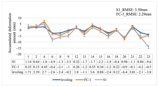 In the following analysis, we focus exclusively on the 16 level points for which valid results were obtained by the Sentinel-1 satellite, as 7 other level points remained invalid despite the application of the DSI method (as shown in Figure 18). Additionally, we present the cumulative deformation data for FC-1 and Sentinel-1 and the leveling measurements in Figure 20, enabling a comparison of the deformation accuracy of both satellites. The measurement errors for FC-1 and Sentinel-1 are summarized in Table 4. Sentinel-1 achieved an RMSE of 3.5 mm, a maximum error of 7.38 mm, an average error of 2.83 mm, and a minimum error of 0.32 mm. In comparison, FC-1 recorded an RMSE of 2.29 mm, a maximum error of 5.52 mm, an average error of 1.83 mm, and a minimum error of 0.34 mm. Both satellites demonstrated millimeter-level accuracy in deformation monitoring; however, FC-1 outperformed Sentinel-1 in three key metrics—RMSE, maximum error, and average error. This superior performance is largely attributed to FC-1’s higher density of PSs and DSs, which provide a greater number of monitoring points around each level point location. The increased number of deformation point samples helps to reduce potential errors, while Sentinel-1’s performance is constrained by its lower resolution. Despite the advanced DSI method, Sentinel-1 could not produce valid results for seven level points, whereas FC-1 provided valid results for all points. Furthermore, although Sentinel-1 produced valid results for the 16 remaining points, its RMSE, maximum error, and average error were inferior to those of FC-1. Our analysis concludes that FC-1’s capabilities in deformation monitoring achieve millimeter-level accuracy, demonstrating its strong potential for future applications in both surface deformation monitoring and infrastructure health assessments.